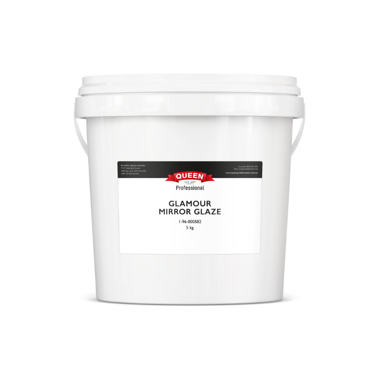 Mirror Glazes have long been constrained to high-end dessert creations, requiring skill, patience and time to produce results. The Queen Professional team have collaborated with pastry chefs to develop a quick, easy and consistent solution for busy kitchens that unleashes mirror glaze applications. Simply choose your base product, customize by adding flavour and colour, then coat your dessert. No heating, cooling or temperature monitoring required. Glamour Mirror Glaze is a silver translucent glaze containing shimmery edible glitter.
