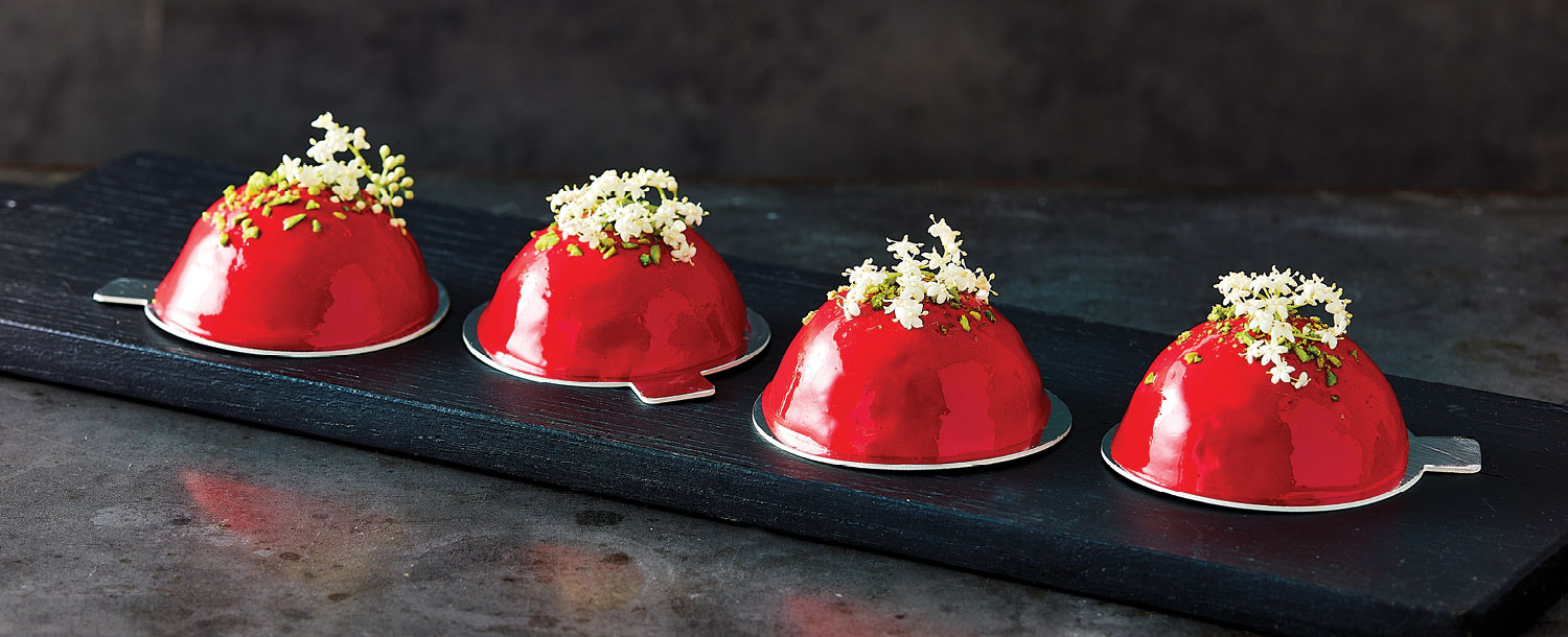 Celebrate the season with this deluxe festive dessert. Brandy spiced mousse, combines with coconut, cranberry and dark chocolate for a taste of nostalgia. A glossy covering of red coloured Queen Professional Mirror Glaze to top it off.