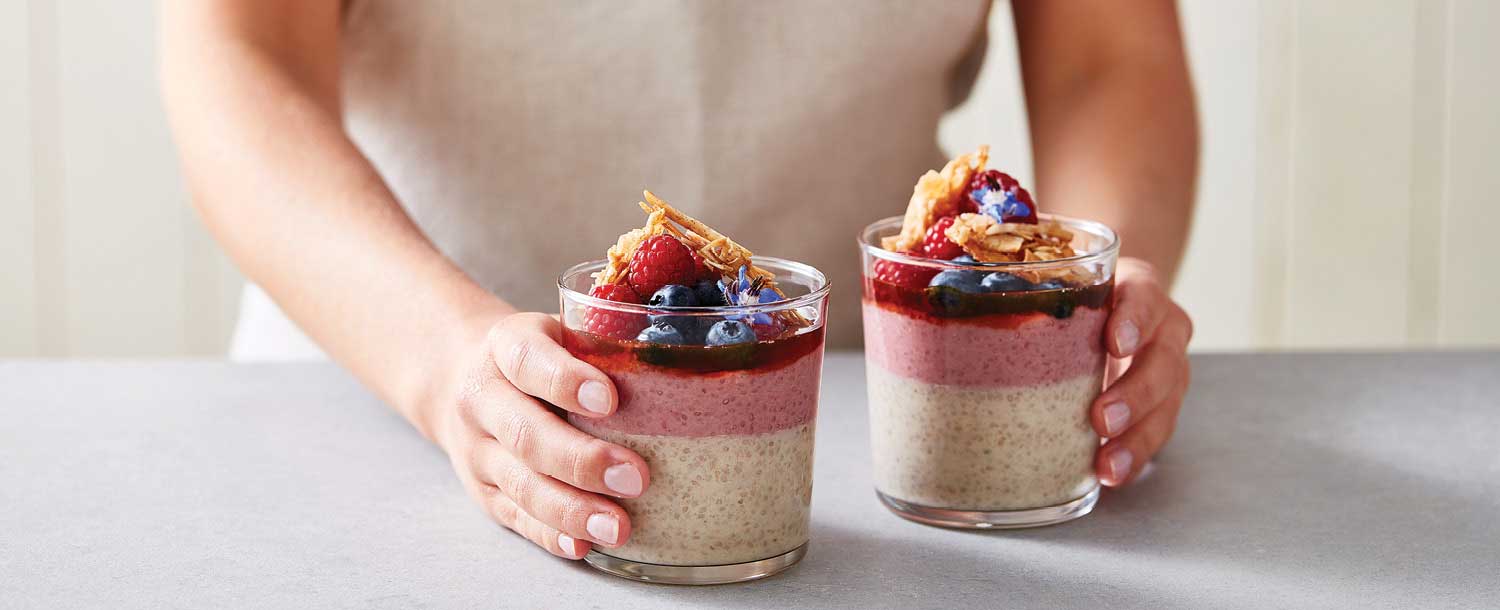 A delicious addition to dessert or breakfast menus, these pretty puddings are a delightful blend of fresh fruit and superfoods, enhanced by the flavours of Queen maple, coconut and vanilla.