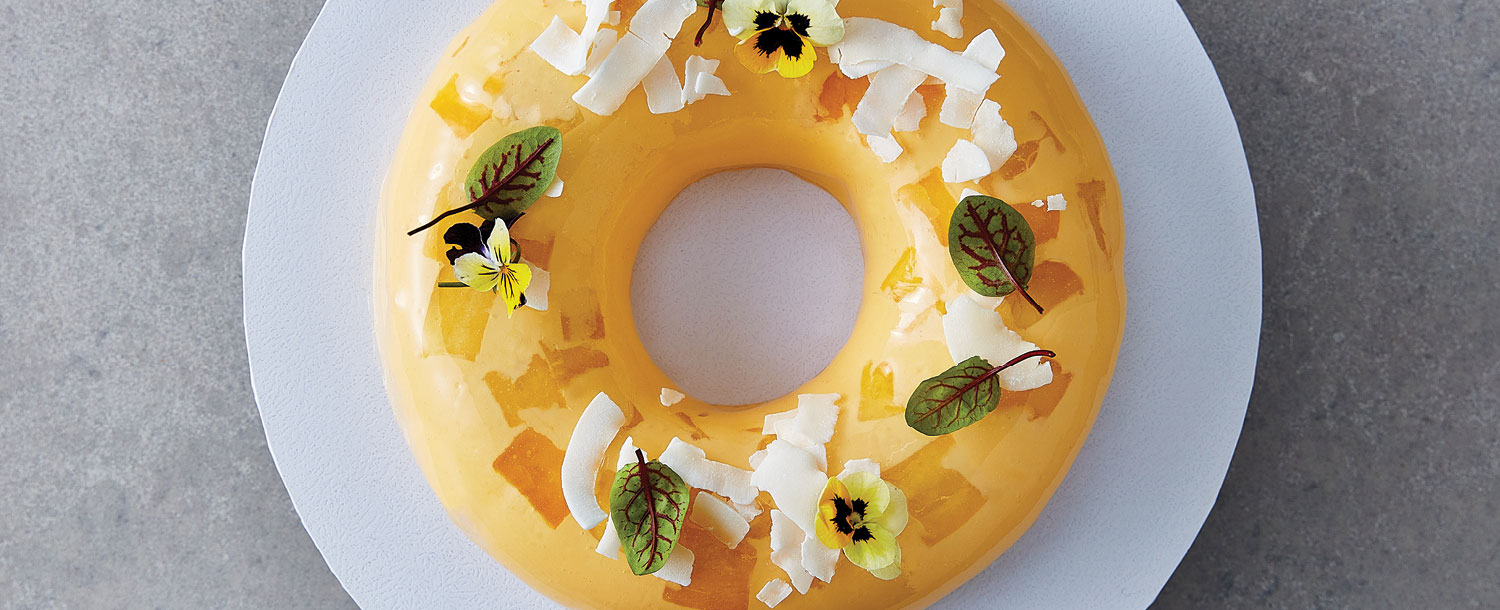 The ultimate taste of summer. A luxuriously layered tropical dessert combining the flavours of Queen Coconut and Vanilla with mango then layered with our glossy Neutral Mirror Glaze for a transparent upscale look. This recipe is Gluten Free.