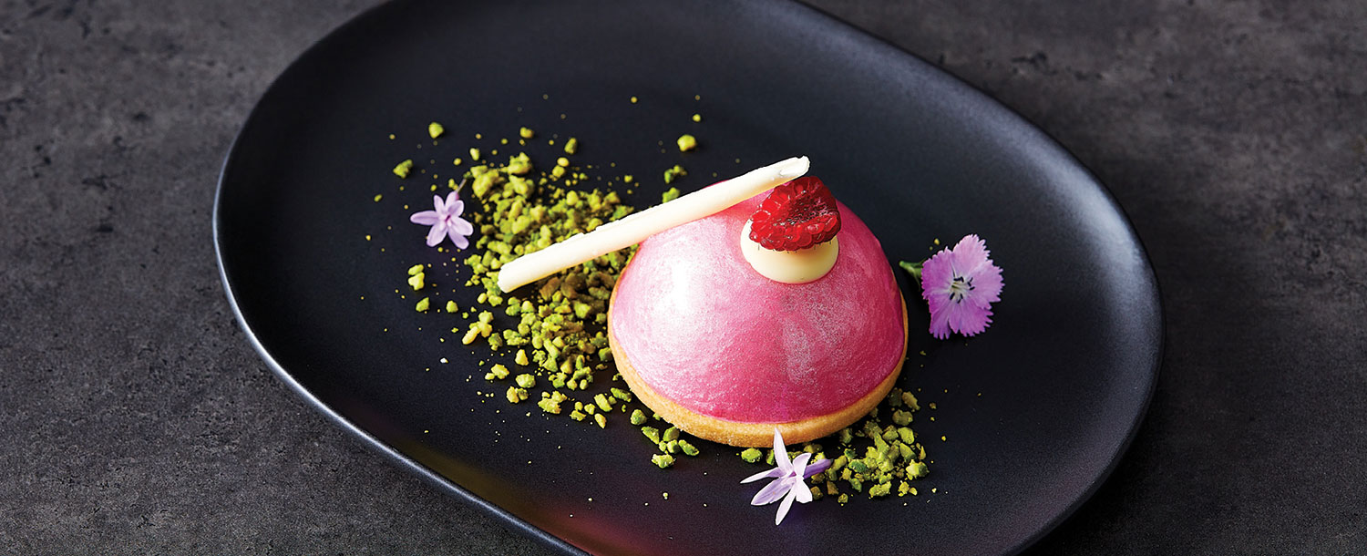 8. Sprinkle plate with crushed pistachios and edible flowers. Place biscuit base on top, then place glazed dome on top of biscuit. Garnish with white choc discs, white choc twirls, raspberries. Serve frozen.